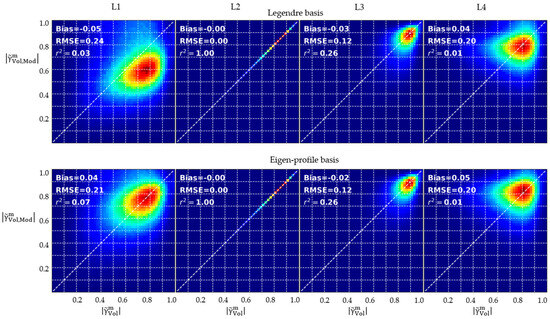 Lopé forest. Correlation histograms between measured and modelled volumetric decorrelation using single-baseline PCT reconstructed vertical reflectivity profile with Legendre (top row) and eigen-profile basis (bottom row). From left to right TanDEM-X acquisitions: L1–L4. Acquisition L2 was used to reconstruct the single-baseline vertical reflectivity profile.