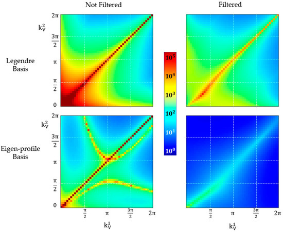 Dual-baseline condition number of Legendre matrix (top row) and eigen-profile matrix (bottom row), not filtered (left column) and filtered (right column).