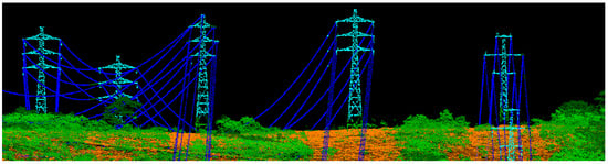Labeled LiDAR point cloud of a scene with power lines where each color represents a different class. The point cloud was obtained by an ALS platform and exhibits a mean density of 27 points per square meter. The precision of LiDAR data is evidenced by their ability to capture the geometric structure of the scene.