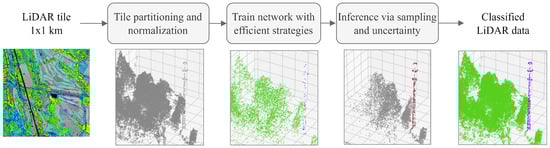 Overview of the LiDAR semantic segmentation pipeline: Each LiDAR tile undergoes a multi-step process, beginning with partitioning into subtiles and normalization of heights. Then, a supervised point-based neural network is trained using efficient strategies for point cloud segmentation. During inference, the method employs sampling techniques that consider point classification uncertainty, resulting in a robust point classification.