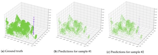 Full ground truth point cloud with 59,694 points and predictions for two different random samples of 8000 points. Green points represent the surrounding category, and purple points represent towers. Predictions vary due to different sampled points. In (b), some points are misclassified as vegetation, while (c) accurately classifies both categories.