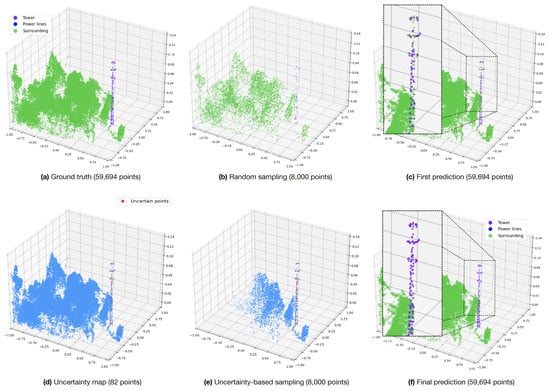 Inference process illustrated from left to right, utilizing uncertainty-based sampling. (a) The complete labeled point cloud is initially presented. (b) The point cloud is transformed into 8000-point samples. (c) Predictions from all samples are obtained and merged. (d) Examination for uncertain points is conducted, identifying points with different predictions marked in red. (e) The point cloud is resampled using uncertainty-based sampling. (f) Final predictions.