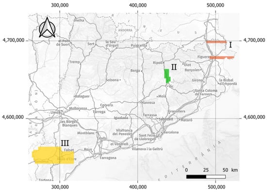 Scanned areas of Catalonia. Alt Empordà (I), Ribera del Ter (II), and Terra Alta (III). The reference system of the indicated coordinates is ETRS89 and it is projected in UTM zone 31N.