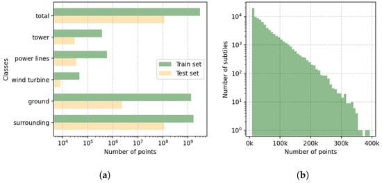 Descriptive histograms depicting the distributions of classes in (a) and the number of points in (b) within m overlapping subtiles.