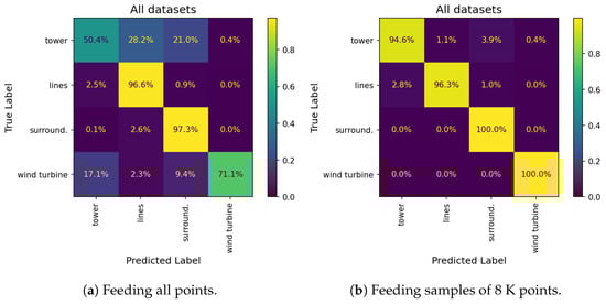 Comparison of normalized confusion matrices obtained by performing inference on all points against 8000-point samplings across the three regions.