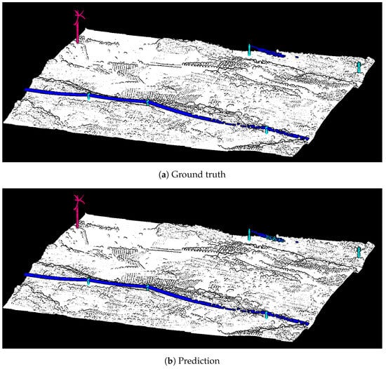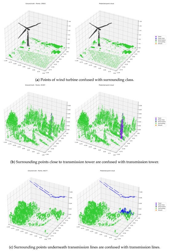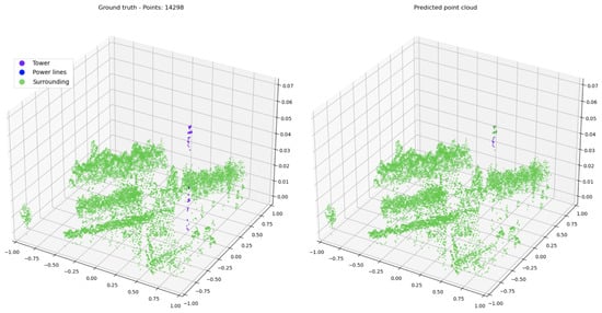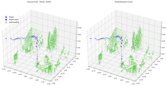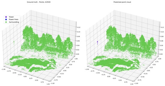 Ground truth (left) and model predictions (right), illustrating the challenge in distinguishing between towers and power lines due to shared structural characteristics and close spatial proximity. Note that the cables are not straight because z is normalized to height above ground.