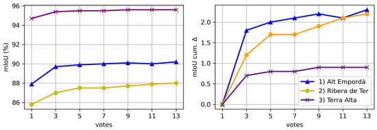 mIoU (%) and cumulative mIoU gain per number of votes for each dataset. The “votes” axis represents the number of votes considered, ranging from 1 to 13. The mIoU value signifies the mean Intersection over Union across all classes for each dataset, while the cumulative mIoU indicates the incremental increase in mIoU per dataset with the addition of votes.