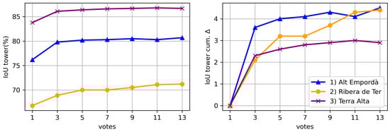 IoU tower (%) and cumulative IoU tower gain per number of votes for each dataset.