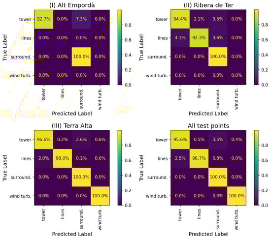 Normalized confusion matrices using PN++ with uncertainty-based inference for each test dataset and across all test points.