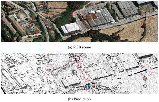 Point cloud scene from Ribera de Ter dataset, colorized by RGB, along with its corresponding semantic segmentation predictions. Towers classified by the model are highlighted and marked with a red circle for easy identification.