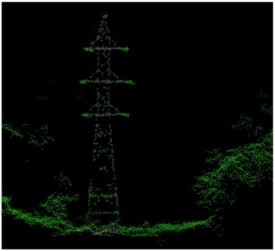 Visualization of a point cloud colorized by NDVI, highlighting points that exceed the threshold of 0.2 in green. The transmission tower surrounded by vegetation exhibits low NDVI values, which are consistent with non-vegetative structures, contrasted with elevated NDVI values on the tower’s cross-arms, likely due to the color assignment process.