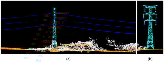 Longitudinal (a) and transversal (b) profiles of a point cloud with a power line from OOD data, displaying predicted labels with different colors.