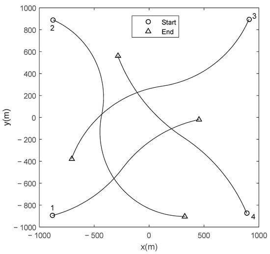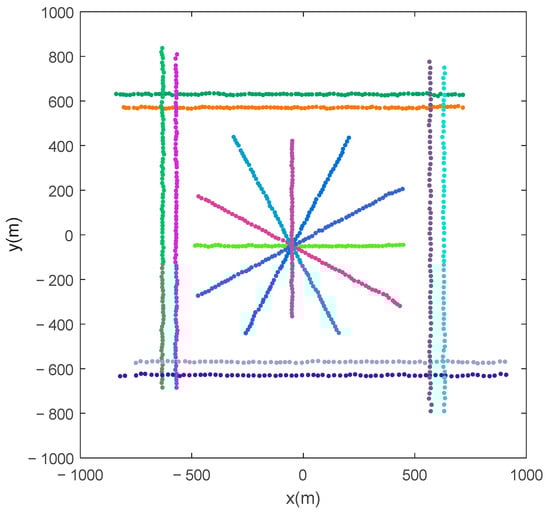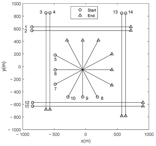 In this section, in order to test the tracking performance of the AMHMB filter, the AGLMB filter in [], the AAMMTB filter in [], and the adaptive GLMB filter in [] were selected as the comparison filters. The adaptive GLMB filter in [] is called the AGLMB1 filter in this article. The original adaptive GLMB filter in [] uses a robust CPHD filter to estimate the clutter rate (or clutter density) and detection probability. Since the estimations of the clutter rate and detection probability are not involved in this article, prior clutter rate and detection probability are used in the AGLMB1 filter. The fixed prior covariance matrix for the AGLMB1 filter is given as follows: