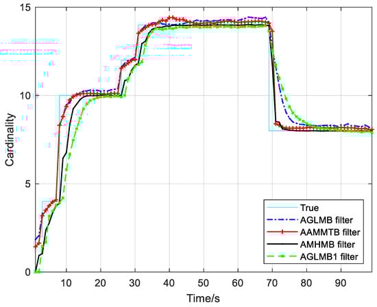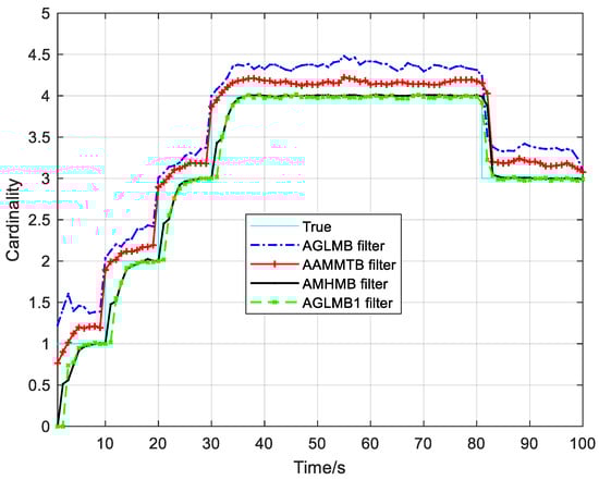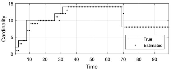 Figure 10 and Figure 11 can be acquired by using the AMHMB filter to handle the simulated measurements in Figure 9. A comparison of Figure 10 with Figure 8 shows that the AMHMB filter can track the four maneuvering targets in the presence of missed detection, clutter, and noise. Figure 11 indicates that it may provide an accurate estimation of object number. Figure 11 also reveals that two to four time steps are required for the AMHMB filter to start tracking a new target.