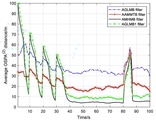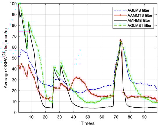 The tracking result (over 250 Monte Carlo runs) in Figure 12 and Figure 13 as well as Table 6 indicates that the OSPA(2) distance and cardinality error of the AMHMB filter are the least among these four filters, and its computational load is moderate: larger than that of the AAMMTB filter and smaller than that of other two filters. Compared with the OSPA(2) distance of the AAMMTB filter, the OSPA(2) distance of the AMHMB filter is reduced by 16% in terms of Table 6.
