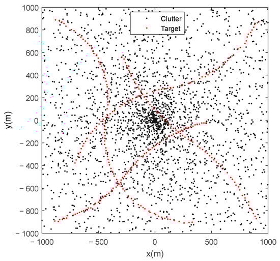 Multi-target tracking (MTT) is a process that uses the sensor observations with clutter, missed detection, and noise to acquire the state vectors of targets at different time steps [,,]. It finds numerous applications in maritime surveillance, air traffic monitoring, self-driving vehicles, and advanced driver-assistance systems [], thereby attracting the extensive attention of scholars [,,,,]. Many approaches such as random finite set (RFS) [,], multiple hypothesis tracking [], and joint probabilistic data association [] have been proposed to perform multi-target tracking.