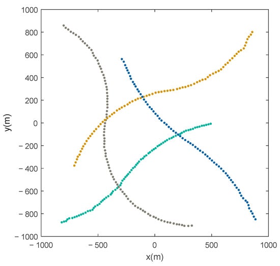 Scenario 2: To test the performance of the AMHMB filter on tracking the maneuvering target, four turn-maneuvering targets are considered in scenario 2. The initial states of targets 1, 2, 3, and 4 are [−900, 20, −900, 5]T, [−900, 25, 900, −10]T, [920, −10, 920, −25]T, and [900, −10, −900, 25]T, respectively. They appear at t = 1 s, t = 10 s, t = 20 s, and t = 30 s and disappear at t = 80 s, t = 101 s, t = 101 s, and t = 101 s, respectively. Their initial turn rates are rads−1, rads−1, rads−1, and rads−1, respectively. These four targets change their turn rates from to at t = 40 s, t = 50 s, t = 60 s, and t = 65 s, respectively, where . The true trajectories of the four maneuvering targets are given in Figure 8. Using process noise , detection probability , average clutter number (i.e., average clutter density is ), and standard deviations of observation noises and to generate simulated measurements, the simulated observations of a Monte Carlo run are given in Figure 9, where black dots denote clutter, and red dots denote the target-originated observations. Due to process noise and observation noise, the target-originated observations deviate from true positions of targets. Some of target-originated observations are missing by reason of missed detection.