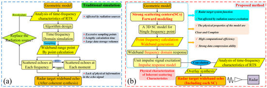 Algorithm comparison, (a) conventional electromagnetic simulation method, and (b) proposed wideband radar target echo forward modeling method.