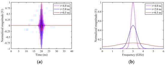 We select three forms of UWB EMPs. For all three signals, the center frequency fm is set to 3 GHz, with width constants tau of 0.5 ns, 2 ns, and 4 ns, respectively, and a time delay t0 of 20 ns. These modulated Gaussian pulse signals, under the specified parameters, are used as radiation sources for time-frequency domain analysis. The resulting radar transmission signal waveforms and their spectra are shown in Figure 4.