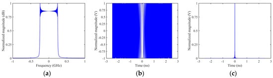 It can be observed that after the LFM signal undergoes matched filtering, its form changes from a wide pulse with a large time-bandwidth product to a narrow pulse. Additionally, the compression ratio r of LFM is equal to the product of the signal’s time-bandwidth product, as shown in Equation (13).