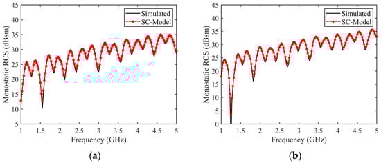 The “Scattering Structures” column in the table provides the corresponding scattering structures for each SC. Leveraging the forward-modeling technique proposed in this research, a precise “one-to-one” correspondence is established between the SCs and the components on the target, with the model encompassing physical parameters such as amplitude, the frequency-dependent factor, and length parameters. Using the established SC model, the RCS characteristics of the target within a wide frequency range are reconstructed and compared with the simulation results obtained using the RL-GO algorithm, as illustrated in Figure 13. The reconstructed RCS closely aligns with the simulation results, further affirming the efficacy of the proposed approach.