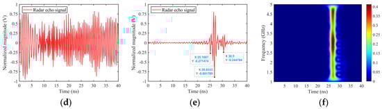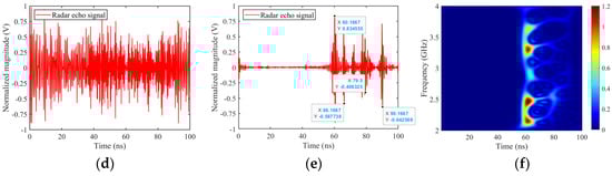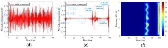 Reconstruction of time–domain echo of simplified tank SC model, θ = 60°, φ = 0°. (a) Stepped frequency radar echo, (b) UWB EMP echo (τ = 2 ns), (c) UWB EMP echo (τ = 4 ns), (d) LFM signal echo (before matched filtering), (e) LFM signal echo (after matched filtering), (f) time-frequency image.
