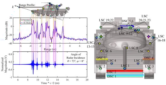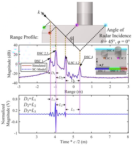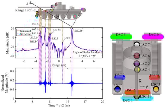 Similar to the SLICY model, Figure 15 illustrates the relationships between the forward-constructed strong SCs and the target’s local scattering structures, the projection points of the SCs on the imaging plane, the positions of the HRRP peak points, and the peak points of the reconstructed time-domain echoes. As shown in the figure, from this observation angle, the surface of the Simplified Tank contains multiple local and distributed SCs. The projection points of each SC on the imaging plane correspond precisely with the HRRP peaks and the reconstructed time-domain echo peaks.