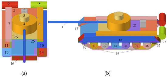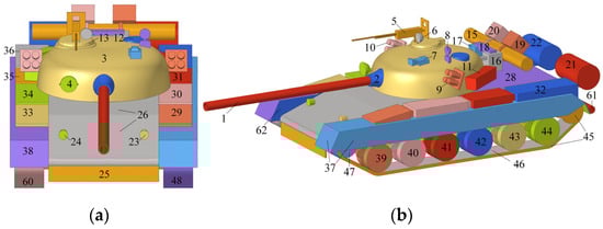 To further demonstrate the applicability and comprehensiveness of the proposed method, this section focuses on the research and analysis of the forward modeling of time-frequency domain scattering echoes for a complex tank target. Compared with simplified tanks, the surface structures of a complex tank are mostly non-typical scattering structures, and the amplitudes of the scattering sources are significantly reduced. To improve the accuracy of the SC model, the target’s CAD model is decomposed into 61 regions, comprising approximately 168,000 facets. The three-dimensional model schematic and the decomposition effect of the model components for the complex tank are shown in Figure 16 and Figure 17, respectively.