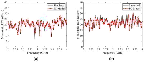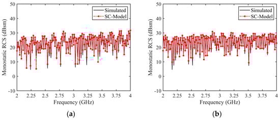 Comparison between RCS reconstructed by the forward SC model of the complex tank and the monostatic simulation results. (a) HH polarization, RMSE = 1.43 dB, (b) VV polarization, RMSE = 2.13 dB.