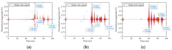 Figure 19 shows the time-domain echo reconstruction results for the SC model under various radiation sources at the radar observation angle of θ = 73° and φ = 0°. It is evident that the envelope of the time-domain echoes for the complex target significantly increases, with strong SCs forming clusters around specific points.