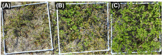 Vegetation at TVC varies between “open tundra”, which is mostly shrub-free, to shrub-dominated patches of either alder or dwarf birch, with individual alders usually separate by more than a meter and interspersed with other vegetation, while dwarf birch patches form a nearly closed and uniform canopy where individuals are closely packed and hard to discern (Figure 2). Vegetation in the open tundra is of a low height (5–25 cm) and is predominantly covered with reindeer lichen (Cladonia rangiferina L.), Sphagnum moss (Sphagnum L.), tussock and non-tussock sedges (e.g., Carex L.), and Labrador tea (Rhododendron groenlandicum). Dwarf birch occurrence is predominantly as small individual plants with considerably less canopy volume (Figure 2A). The open tundra primarily occurs on the flatter hilltop summits that feature gradual elevation changes and wetter conditions, with Sphagnum occurring in slightly deeper flow melt paths. Upland, individual small dwarf birch individuals are common, and patches of alder and birch occur on these flat lands, albeit at lower density and reduced size. Transitioning from open tundra, low-growing woody vegetation (e.g., Vaccinium uliginosum, Rhododendron tomentosum, R. lapponicum, Betula glandulosa) increase in abundance with these species closely interspersed (Figure 2B) until alder or dwarf birch dominate. Dwarf birch dominant patches (Figure 2C) have a relatively closed canopy, stem density is higher, and vegetation heights are 40–60 cm, reaching >70 cm on ridge tops. Dwarf birch patches remain quite intermixed with other species, particularly in the understory. The hummock-hollow microtopography influences species composition, with hollows increasingly dominated by lichens, sphagnum, and labrador tea. Dwarf birch patches predominate sloped terrain, hillslopes, and the tops of ridges, and densities are higher on western-facing sloped terrain.