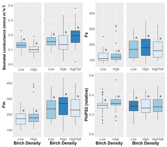 Physiological activity of birch as a function of birch density. Data for each campaign displayed with the left exclusive to the Grid data points, and right the Circle data points. Boxplots with different letters are significantly different according to Tukey’s HSD. Top left: stomatal conductance. Top Right: steady-state fluorescence. Bottom Left: maximum fluorescence. Bottom Right: Quantum efficiency of the PSII system.
