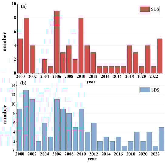 - The spring cross-border SDSs between Northern China and Mongolia during 2000–2023 have been identified and documented. There were 76 cross-border SDSs during this period, and their occurrence frequency showed a declining trend with fluctuations. In the first decade of the 21st century, both countries experienced frequent spring SDSs, with as many as nine cross-border SDSs occurring in the spring of 2006. The SDS frequency gradually decreased from 2011 to 2017. In recent years, however, the cross-border SDSs have resumed their frequent activity. During the spring of 2000–2023, cross-border SDSs accounted for 55.1% of the total SDSs that occurred in Northern China and Mongolia.