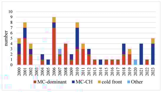 - The weather systems that trigger and drive cross-border SDSs can be categorized into three types, namely the MC-dominant type, MC-CH type, and cold front type. Among the total cross-border SDS cases, the MC-dominant type drove 41 SDSs, accounting for 53.9%; the MC-CH type was responsible for 25 SDSs, accounting for 32.9%; the cold front type caused eight SDSs, accounting for 10.5%; and other weather types triggered only two SDSs, accounting for 2.6%.