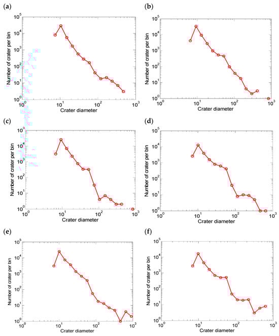The statistical completeness of the identified small impact craters in the ten landing areas was calculated using crater size–frequency distributions: (a) Apollo 11; (b) Apollo 12; (c) Apollo 14; (d) Apollo 15; (e) Apollo 16; (f) Apollo 17; (g) Luna 16; (h) Luna 20; (i) Luna 24; and (j) Chang’e-5.
