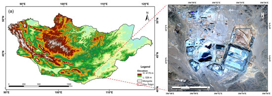 Geographical location of the study area—(a) Digital elevation model (DEM) of Mongolia; (b) Sentinel-2 image of OT mine on 30 December 2022.