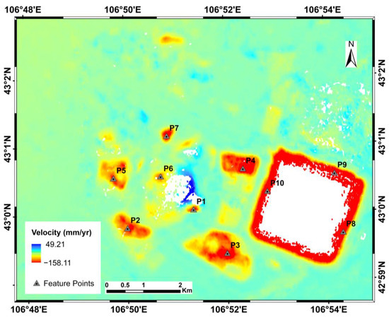 Annual average surface deformation rate (unit: mm/year) with P1 to P10. P1 to P10 indicate ten characteristic subsidence points used for comprehensive time-series subsidence analysis in Section 4.2.