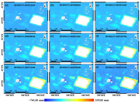 To analyze the temporal variability of surface subsidence at the OT mine site over this period, we mapped and compared accumulated surface deformation data from 11 January 2018, to 28 December 2022 (Figure 6). This figure highlights nine cumulative surface deformation datasets across various time intervals, offering a nuanced view of the temporal and spatial dynamics within the OT mining regions. Over the study period, specific areas of the mine exhibited a progressive increase in uplift, denoted by an intensifying blue hue. In contrast, conspicuous yellow and red discolorations emerged, signaling the gradual development of subsidence funnels.