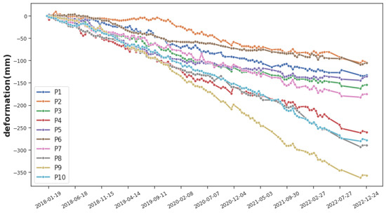 Figure 5 presents the meticulous selection of ten characteristic subsidence points within the primary subsidence zones, chosen for comprehensive subsidence analysis. The distribution of these points varies within the study area. Specifically, P1 to P7 are situated near the mining area, while P8 to P10 are positioned in the water storage area, all integral to the primary operational zones. Simultaneously, these points exhibit varying degrees of subsidence. To investigate the temporal evolution of subsidence at specific feature points, a time-series subsidence map was generated for each one. Figure 7 illustrates that P2 and P6 display minor subsidence, followed by P1, P3, P5, and P7. P4, P8, and P10 exhibit more substantial subsidence, with P9 demonstrating the most significant subsidence, with the overall cumulative subsidence in the range [0, −400] mm over time. Furthermore, we note that the variation in cumulative subsidence at each point remains relatively minimal until 2020. However, starting from that point, these differences progressively intensify.