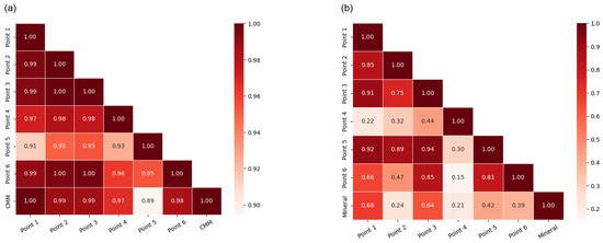 Correlation matrix—(a) Correlation matrix of cumulative subsidence and cumulative mineral mined (CMM refers to cumulative mineral mined); (b) Correlation matrix of annual subsidence and annual minerals mined (‘Mineral’ refers to mineral mined).