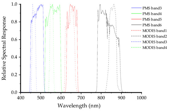 Due to the use of MODIS BRDF parameters, this paper selected B3 (450–515 nm), B4 (525–600 nm), B5 (630–680 nm), and B6 (784.5–899.5 nm) with a 5 m resolution similar to MODIS satellite settings for the angle effect correction study. Figure 2 illustrates the comparative spectral response functions of the Jilin-1 GP01/02 PMS and MODIS. Given that the blue band is susceptible to contamination from residual atmospheric influences, it was excluded from the accuracy assessment in the monitoring of crop parameters [38].