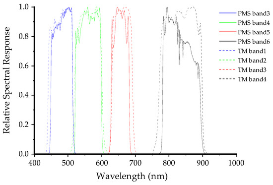 Spectral response functions of Jilin-1 GP01/02 PMS and Landsat TM in visible to near-infrared bands.