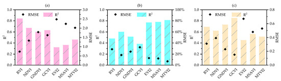 VIs-based LAI, FVC, and chlorophyll (T850 nm/T720 nm) estimations. The X-axis is the vegetation index, the left Y-axis is the R2 value, and the right Y-axis is the RMSE value. (a) LAI, (b) FVC, and (c) chlorophyll (T850 nm/T720 nm).