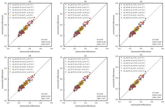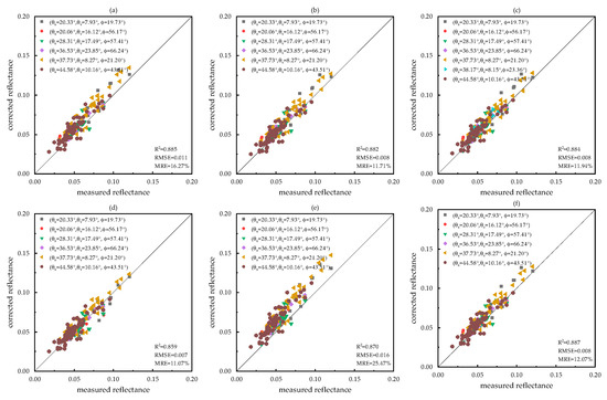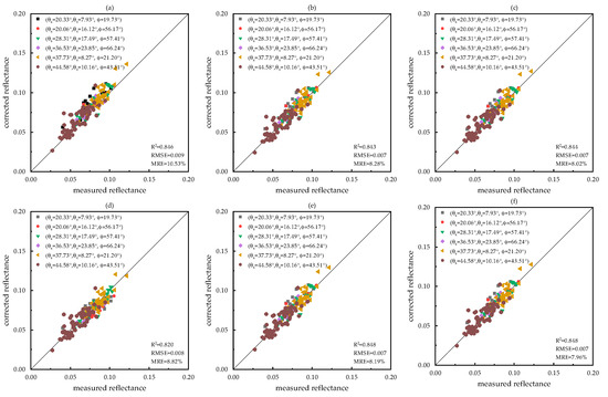 Green band reflectance validation based on field measured data. The X-axis is the measured reflectance, the Y-axis is the corrected reflectance, the black solid line is the 1:1 line, and the different color scatter points represent the different observation geometry. (a) Original, (b) MODIS-based, (c) AFX, (d) VJB, (e) Fixed-Landsat, And (f) Fixed-Jilin-1.