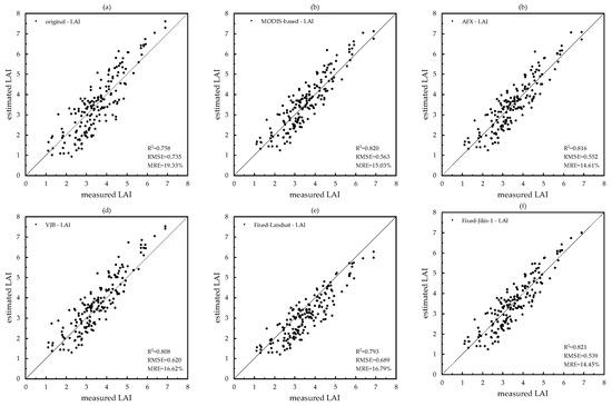LAI validation based on field measured data. The X-axis is the measured reflectance, the Y-axis is the corrected reflectance, and the black solid line is the 1:1 line. (a) Original, (b) MODIS-based, (c) AFX, (d) VJB, (e) Fixed-Landsat, and (f) Fixed-Jilin-1.