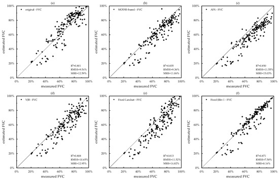 FVC validation based on field-measured data. The X-axis is the measured reflectance, the Y-axis is the corrected reflectance, and the black solid line is the 1:1 line. (a) Original, (b) MODIS-based, (c) AFX, (d) VJB, (e) Fixed-Landsat, and (f) Fixed-Jilin-1.