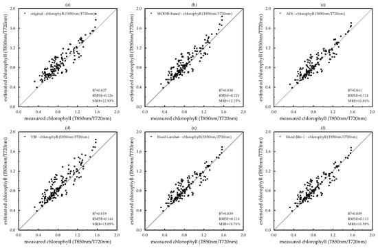 Chlorophyll (T850 nm/T720 nm) validation based on field measured data. The X-axis is the measured reflectance, the Y-axis is the corrected reflectance, and the black solid line is the 1:1 line. (a) Original, (b) MODIS-based, (c) AFX, (d) VJB, (e) Fixed-Landsat, and (f) Fixed-Jilin-1.