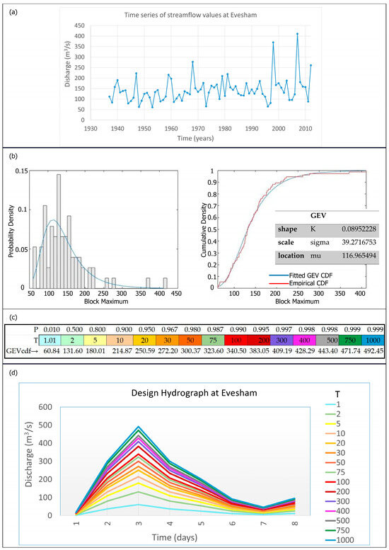 The methodology applied for generating design hydrographs at Evesham gauge station (see paragraph 3.1). (a) Time series of streamflow values. (b) Fitting of generalized extreme value cumulative distribution function. (c) Flood scenarios associated with return periods. (d) Design hydrograph shaped on flood events occurring in the week 19 July 2007–26 July 2007 (peak on 21 July 2007.