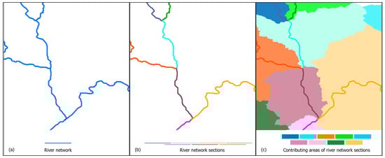 Subsequently, the hydrographic network is delineated by applying a threshold to the flow accumulation map, whereby drains and river channels are identified as commencing when a sufficiently extensive area is drained (Figure 3a). Following this, the channels are automatically segmented into sections through a river segmentation process that depends on detecting intersections of streams (Figure 3b). Lastly, the upstream regions that contribute flow to the sections determine the sub-catchments (Figure 3c). Depending on the threshold set on the flow accumulation map, the resulting sub-catchments vary in size, thereby altering the number of spatial subdivisions within the catchment.