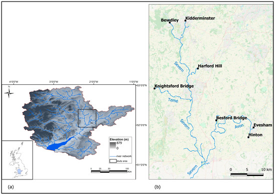 The proposed methodology is applied to a downstream part of the River Severn basin around the city of Tewkesbury (UK). The River Severn has its source on the Welsh northeastern mountains and flows southeastward to the Vale of Gloucester and the Bristol Channel. Figure 4a shows the Severn catchment and river network, and Figure 4b shows the study area (hydraulic model domain) and the hydrometric gauging stations used as upstream boundary conditions of the shallow water model (black squares). The domain area is 30.5 km by 52.4 km and is located on the lower Severn. The River Teme and River Avon are tributaries of the River Severn within the model domain. The study area was rather frequently inundated over the past decades [32].